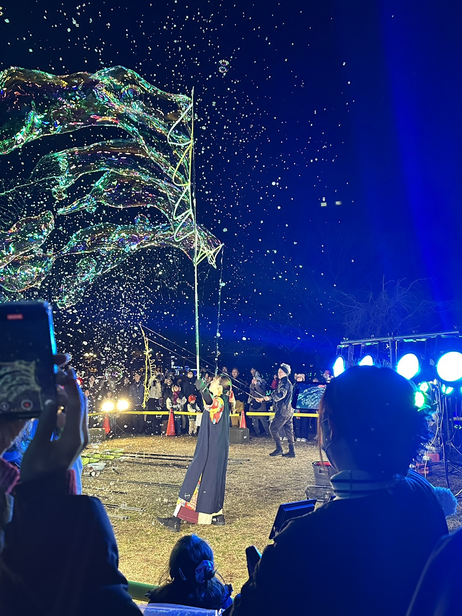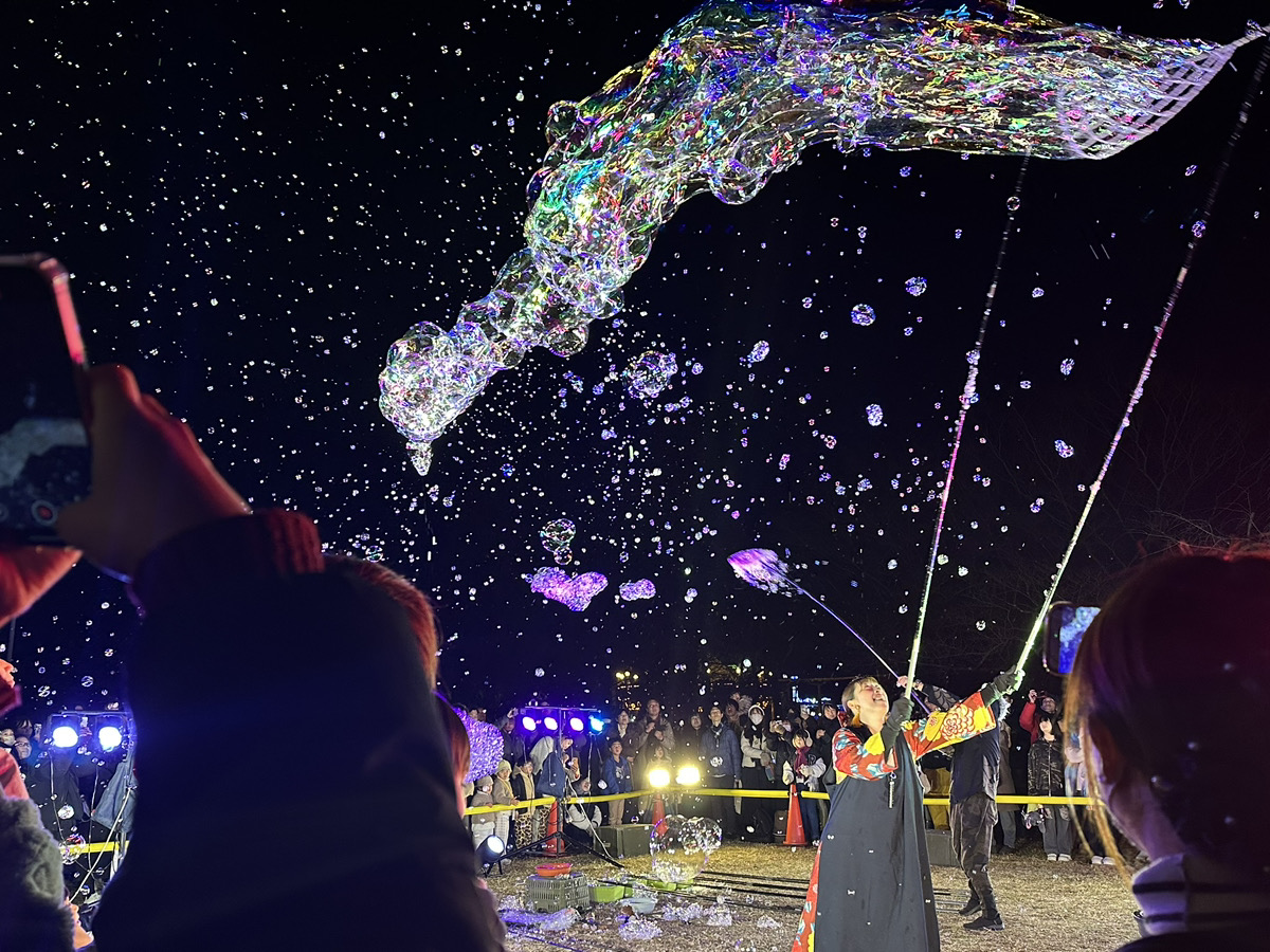 光を当てて夜空に舞うシャボン玉を楽しむエンターテイメントで、とても綺麗でした。