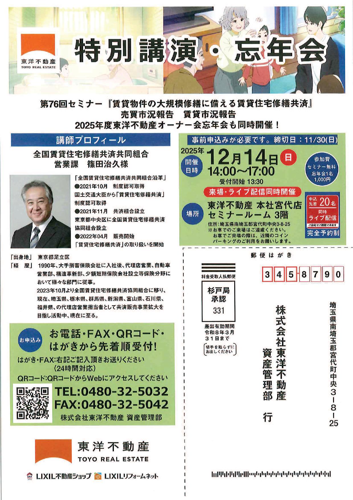 12/14(日)14:00より『東洋不動産オーナーセミナー 賃貸物件の大規模修繕に備える賃貸住宅修繕共済』(東洋不動産第76回オーナーセミナー)を全国賃貸住宅修繕共済協同組合 営業課 篠田治久様を講師...